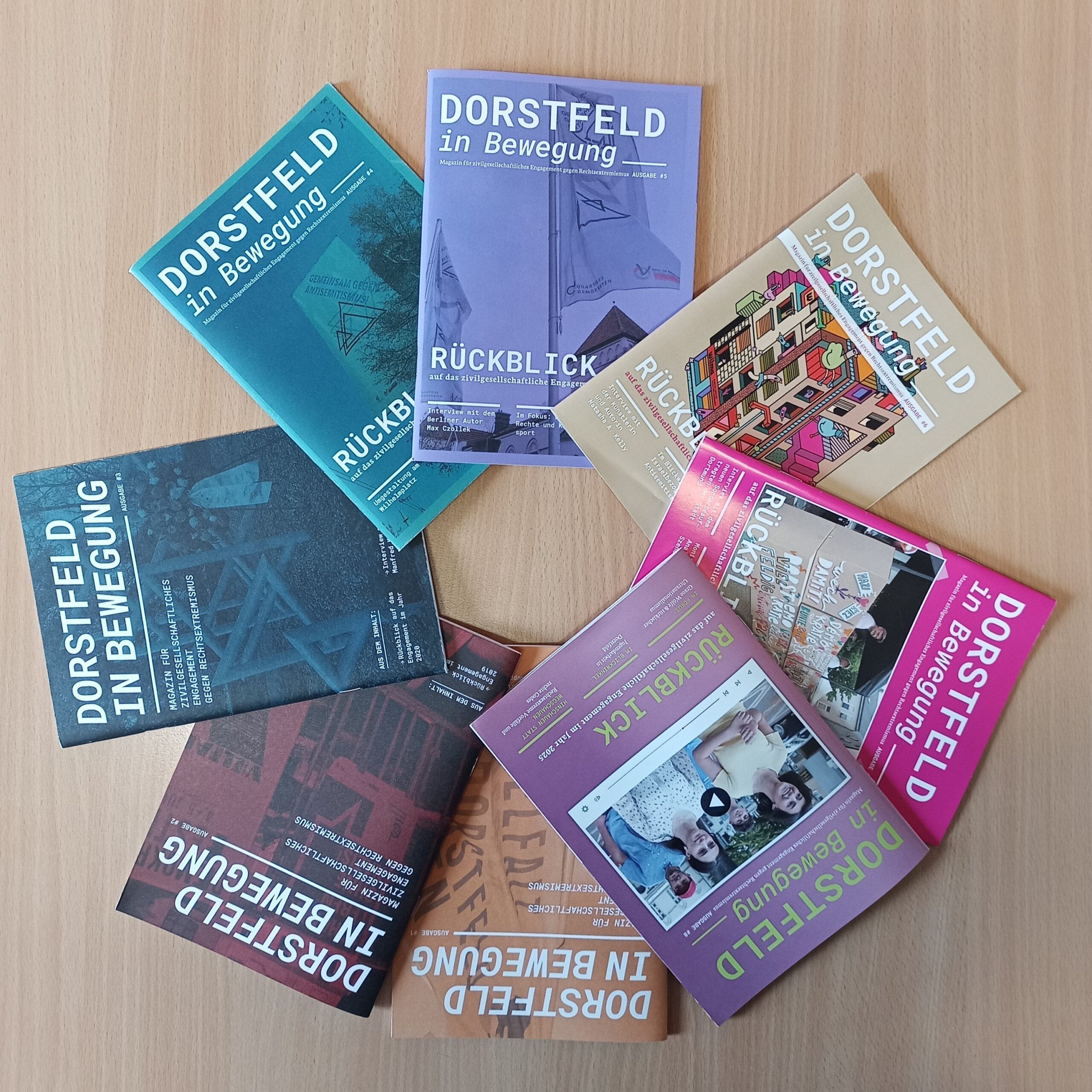 Das Magazin »Dorstfeld in Bewegung« wird von uns seit 2019 Anfang jeden Jahres veröffentlicht und berichtet über zivilgesellschaftliches Engagement für Demokratie und gegen Rechtsextremismus in Dorstfeld. Mit dem Format eines Stadtteilmagazins möchten wir eine Plattform anbieten, die das Engagement der Dorstfelder Zivilgesellschaft transparent und sichtbar macht und damit auch stärken soll. »Dorstfeld in Bewegung« richtet sich damit an alle Personen, die sich für die Situation in Dorstfeld interessieren und mehr über das Engagement vor Ort erfahren möchten. So finden sich in dem Magazin Berichte über vergangene Aktionen der Dorstfelder Zivilgesellschaft, Interviews mit verschiedenen Expert*innen und Engagierten aus Dorstfeld, Analysen zum Rechtsextremismus und viele Informationen zu Entwicklungen im Stadtteil.